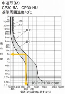 測定対象のサーキットプロテクターを仮に三菱電機社製のCP-30 定格値20(A) とします。5 秒経過時に定格電流 20 (A) に対する倍率は下記の図から400 % (4 倍)が導かれます。