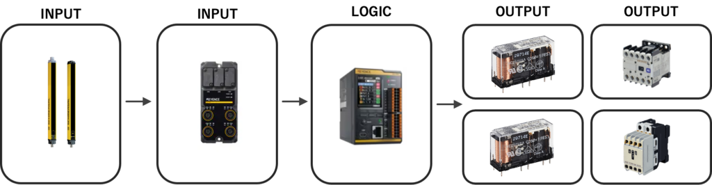 英語のElectro-Sensitive Protective Equipment の頭文字をとったもので、ESPE と表されます。ライトカーテンやレーザースキャナなどのように、電気的に人の存在や侵入を検知する装置の総称です。最低限の構成として、検知デバイス、制御監視デバイス、そして出力信号切替デバイスが含まれるものを指します。
