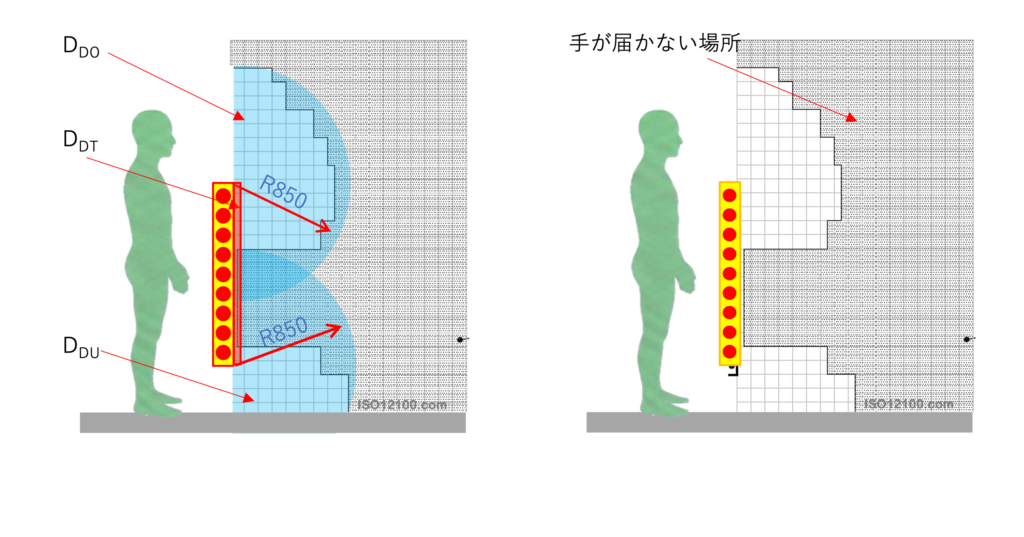 検出ゾーンの上端を乗り越えて、危険源へ手を伸ばすリスクアセスメントをします。