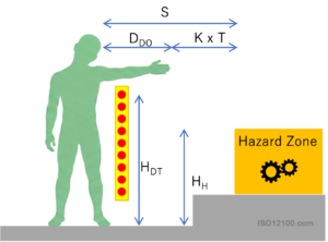 - T: システム全体の応答時間。安全保護装置、制御システム、機械の停止時間など全ての遅延時間の合計です。
