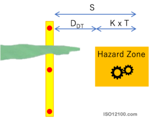 - T: システム全体の応答時間。安全保護装置、制御システム、機械の停止時間など全ての遅延時間の合計です。