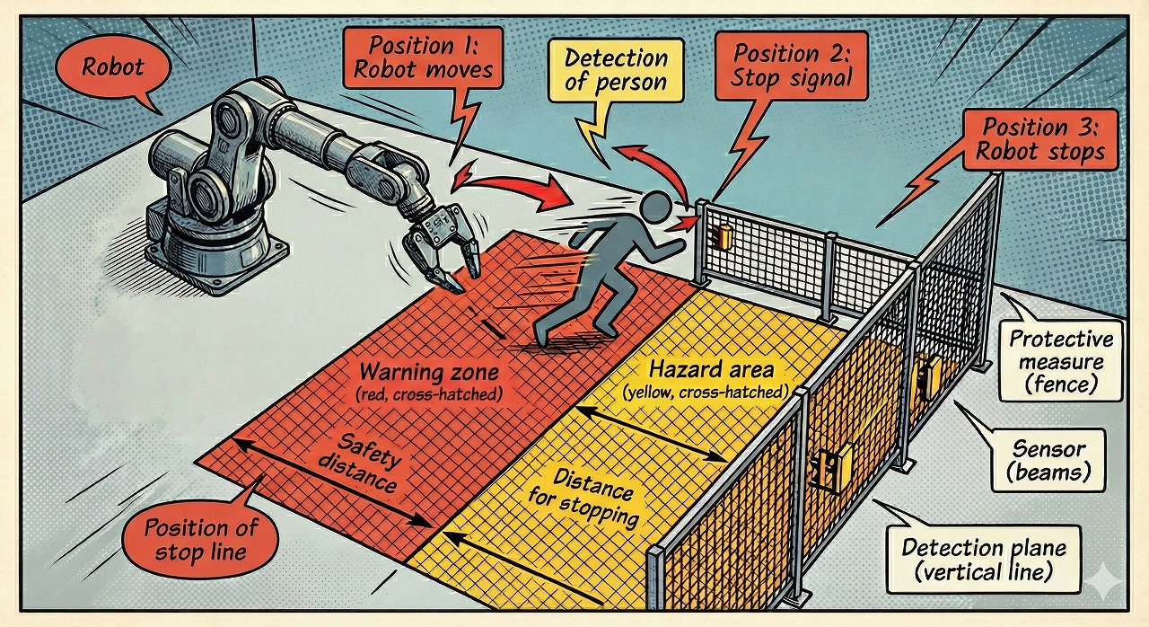 本稿では、ある程度機械安全の知識をお持ちの方を対象に、このISO 13855:2025の核心部分について解説します。特に第6章の動的分離距離に特化し、その理論的背景から具体的な計算手法、そして実務への影響までを可能な限り詳細に紐解いていきます。